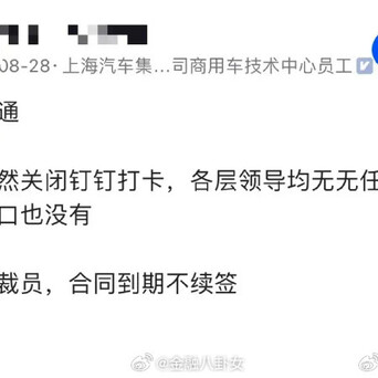 【#传上汽大通关闭考勤系统进行内部裁员#,满140减70】近日,在脉脉上,多位网友发帖称,上汽大通已经关闭钉钉考勤打卡,将开始内部裁员。“上汽大通近期突然关闭钉钉打卡,各层领导均无任何解释,借口也没有。离职,裁员,合同到期不续签。”“钉钉打卡关不,事出反常必有妖。果然,140任(人)裁70个。”一位上汽商用车技术中心员工发帖称,此轮上汽大通在南京将整体裁员40%,人力资源总监已经抵达南京,从8月30日开始约谈。“上周取了三天,已经裁了很多。”
