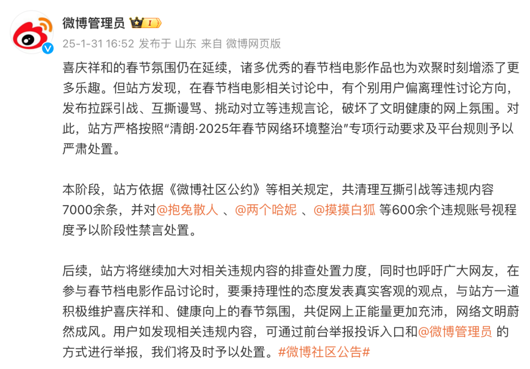 1月31日股票多少钱可以杠杆,据@微博管理员 消息,喜庆祥和的春节氛围仍在延续,诸多优秀的春节档电影作品也为欢聚时刻增添了更多乐趣。但站方发现,在春节档电影相关讨论中,有个别用户偏离理性讨论方向,发布拉踩引战、互撕谩骂、挑动对立等违规言论,破坏了文明健康的网上氛围。对此,站方严格按照“清朗·2025年春节网络环境整治”专项行动要求及平台规则予以严肃处置。